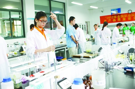 6月8日,2012年全国职业院校农产品质量安全检测大赛 “蔬菜中有机磷类农药残留检测”项目的比赛现场,选手张婵婵目不转睛地盯着移液管内正在上升的液体,当液面上升到刻度标线以上约1cm时,只见她迅速用右手食指堵住管口,取出移液管,麻利地用滤纸条擦干移液管下端外壁……每个动作都严格按照操作规范进行,因为这直接决定着检测结果的准确程度,也就是她最终的比赛成绩。